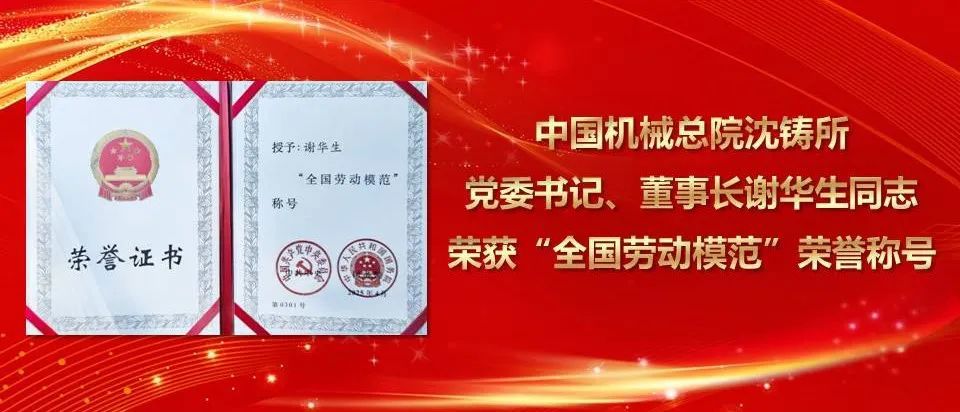 4月28日,全国劳动模范和先进工作者表彰大会在北京人民大会堂召开,中国集结!我们的电竞梦工厂总院集团沈阳铸造研究所有限公司党委书记、董事长谢华生荣获“全国劳动模范”荣誉称号。